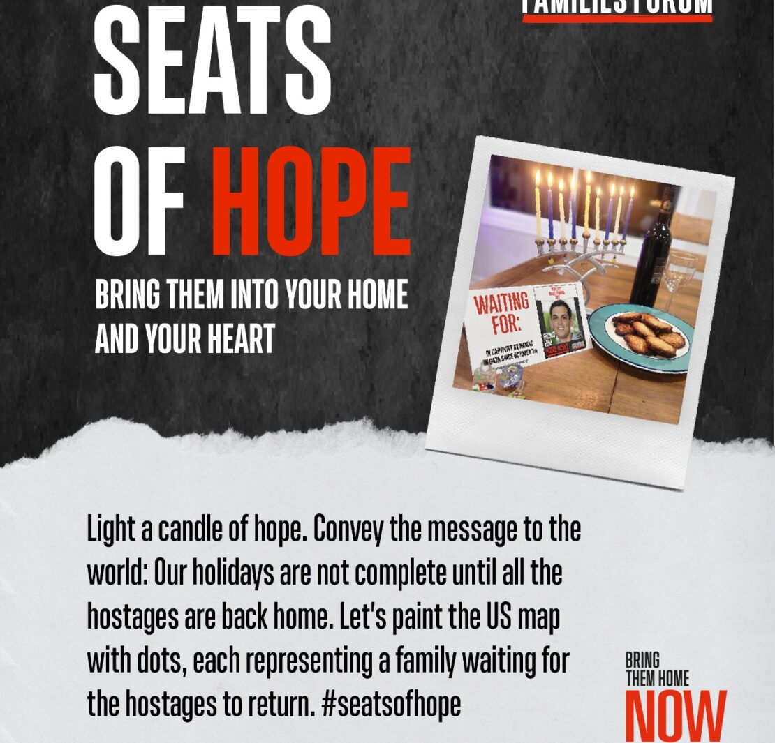 Seats of Hope initiative, as part of the Hostages and Missing Families Forum, invites you to save a spot for a hostage at your table, in your family gatherings and celebrations, and mainly in your heart.