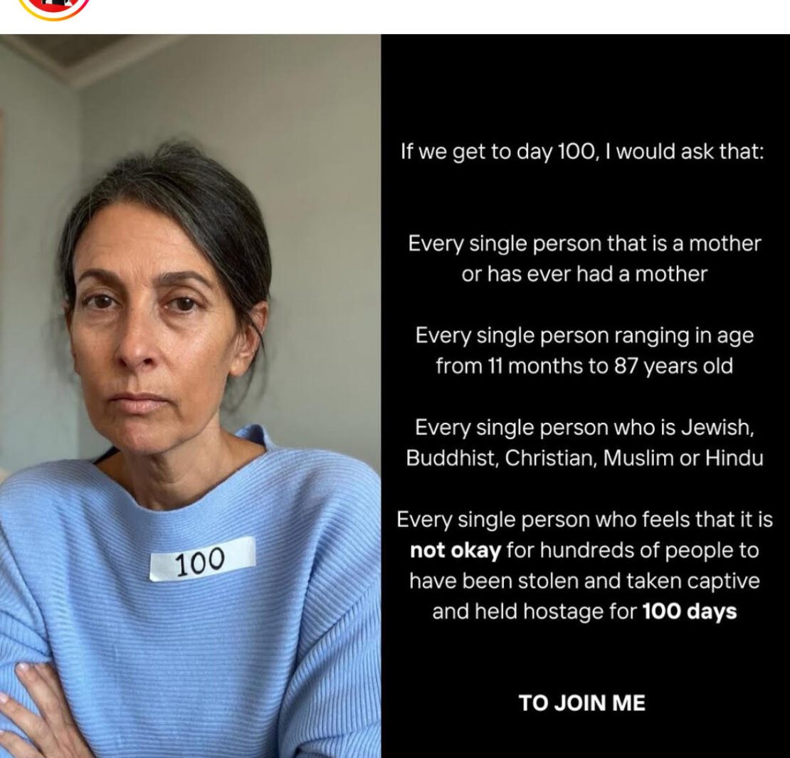 2. In solidarity with the hostages families – join me on the 100th day of Hersh’s heartbreaking captivity in solidarity with his mother Rachel Goldberg. I’ll be wearing masking tape over my heart with the number 100, as Rachel has done to mark every single day her son has been stolen from her. Bring Hersh and every single hostage home now.